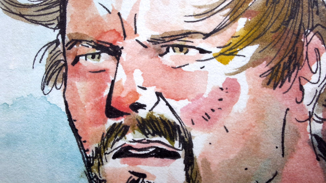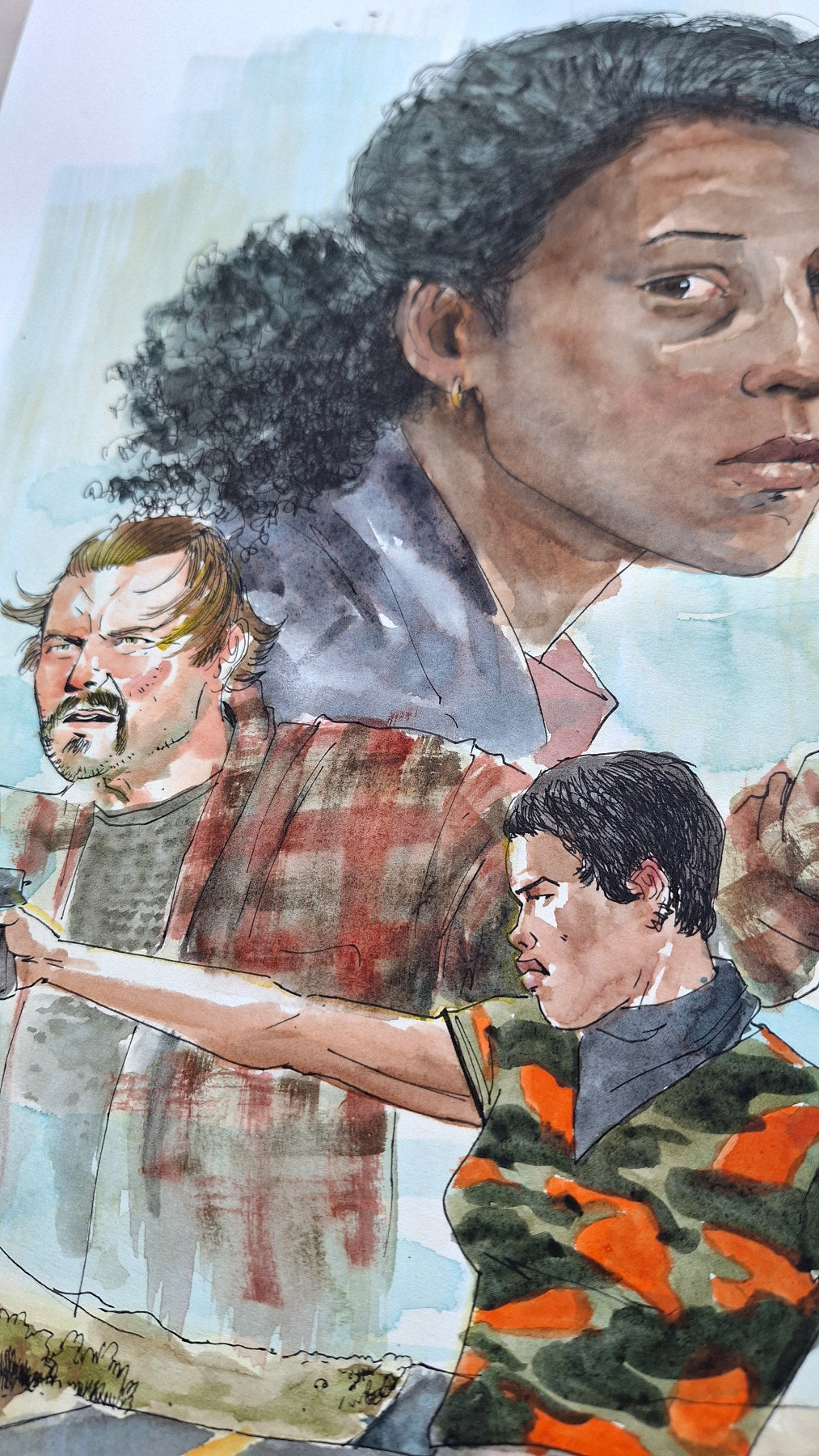 lustración original en tinta y acuarela de la película UNA BATALLA TRAS OTRA.